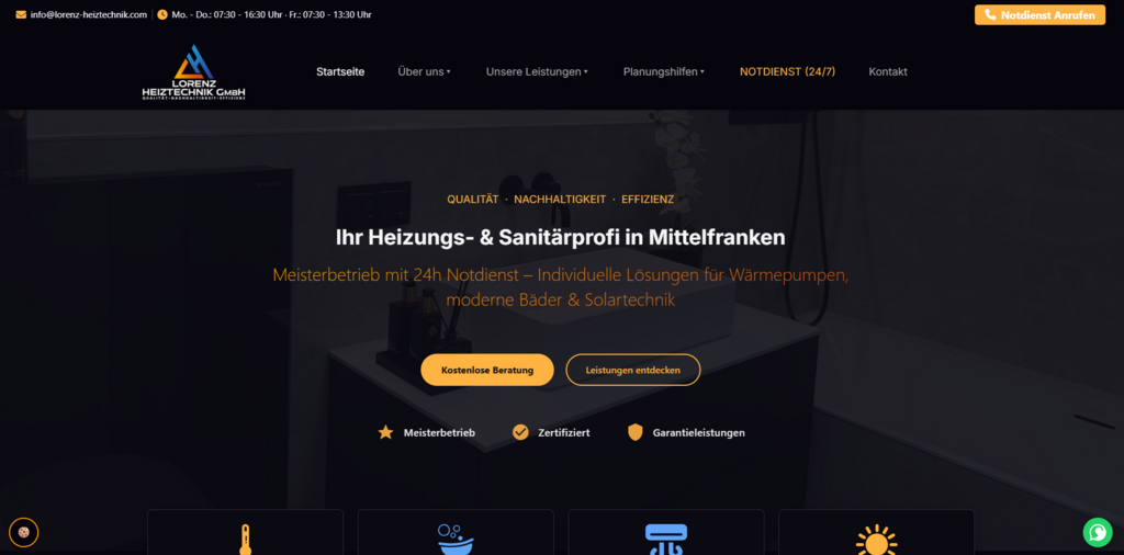 - Bis zu 8 Unterseiten (z.B. Home, Leistungen, Über uns, Kontakt)